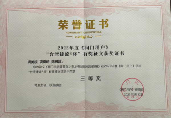 文章詳情在2022年《閥門用戶》“臺(tái)灣捷流杯”征文活動(dòng)中,由黃山良業(yè)智能控制股份有限公司終身名譽(yù)董事長(zhǎng)項(xiàng)美根、總經(jīng)理項(xiàng)曉明,湖南云箭集團(tuán)有限公司陳可見三人撰寫,發(fā)表在《閥門用戶》雜志上的論文《閥門電動(dòng)裝置在小型水電站的新應(yīng)用》榮獲三等獎(jiǎng),并獲業(yè)內(nèi)專家學(xué)者的高度評(píng)價(jià),評(píng)獎(jiǎng)中專家學(xué)者的評(píng)語(yǔ)有: