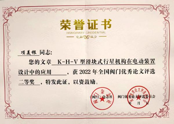 由黃山良業(yè)智能控制股份有限公司項(xiàng)美根終身名譽(yù)董事長(zhǎng)撰寫,并發(fā)表在2022年第五期《閥門》雜志上的論文《K-H-V型滑塊式行星機(jī)構(gòu)在電動(dòng)裝置設(shè)計(jì)中的應(yīng)用》,榮獲2022年全國(guó)閥門優(yōu)秀論文二等獎(jiǎng)。